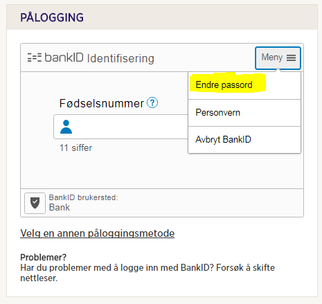 Jeg driver å skal bestille noe greier på nettet, og skriver inn engangskoden null problem, etter det må jeg skrive inn personlig passord. Er det mulig å bytte personlig passord på bankID? Du kan endre ditt passord underveis i innloggingsprosessen i nettbanken.